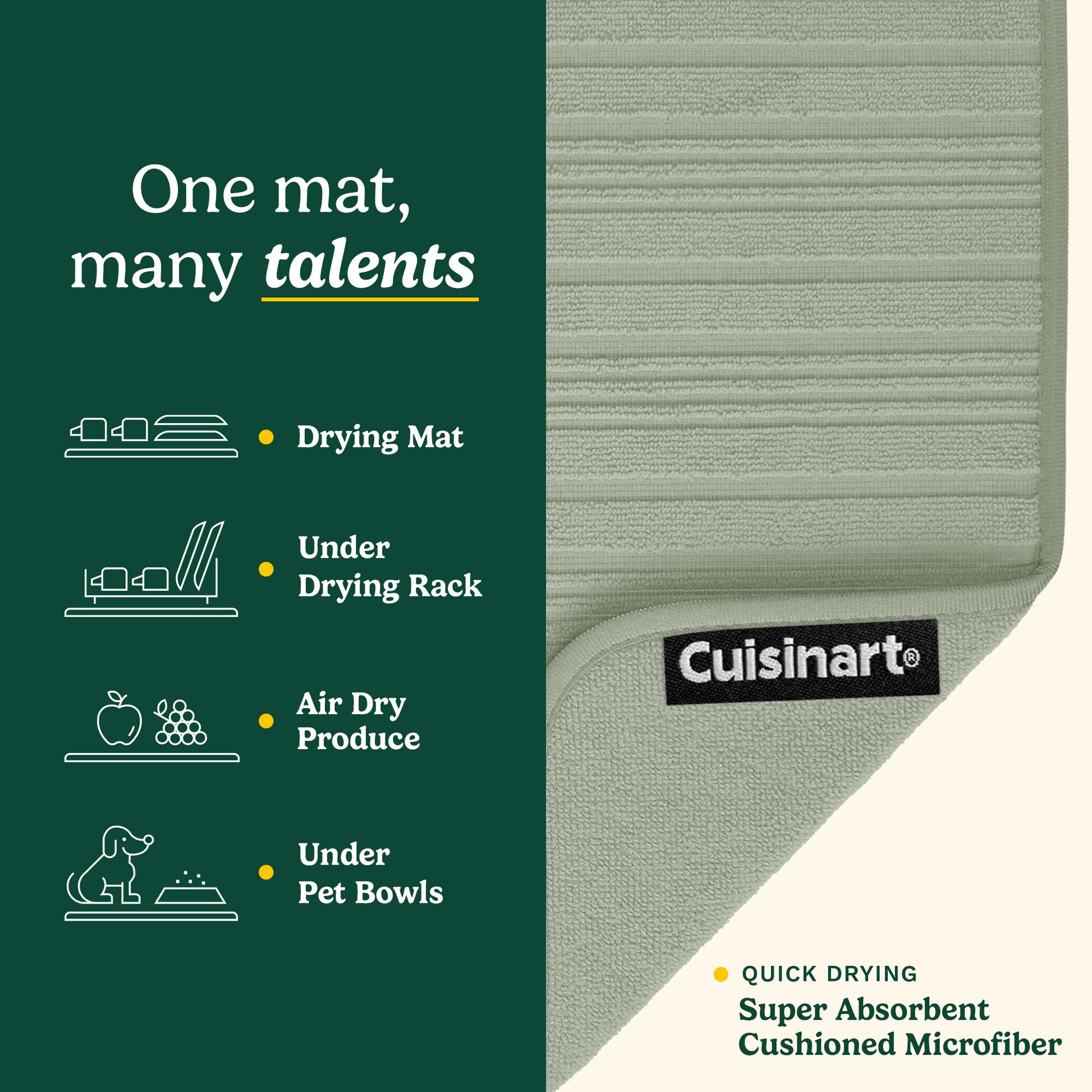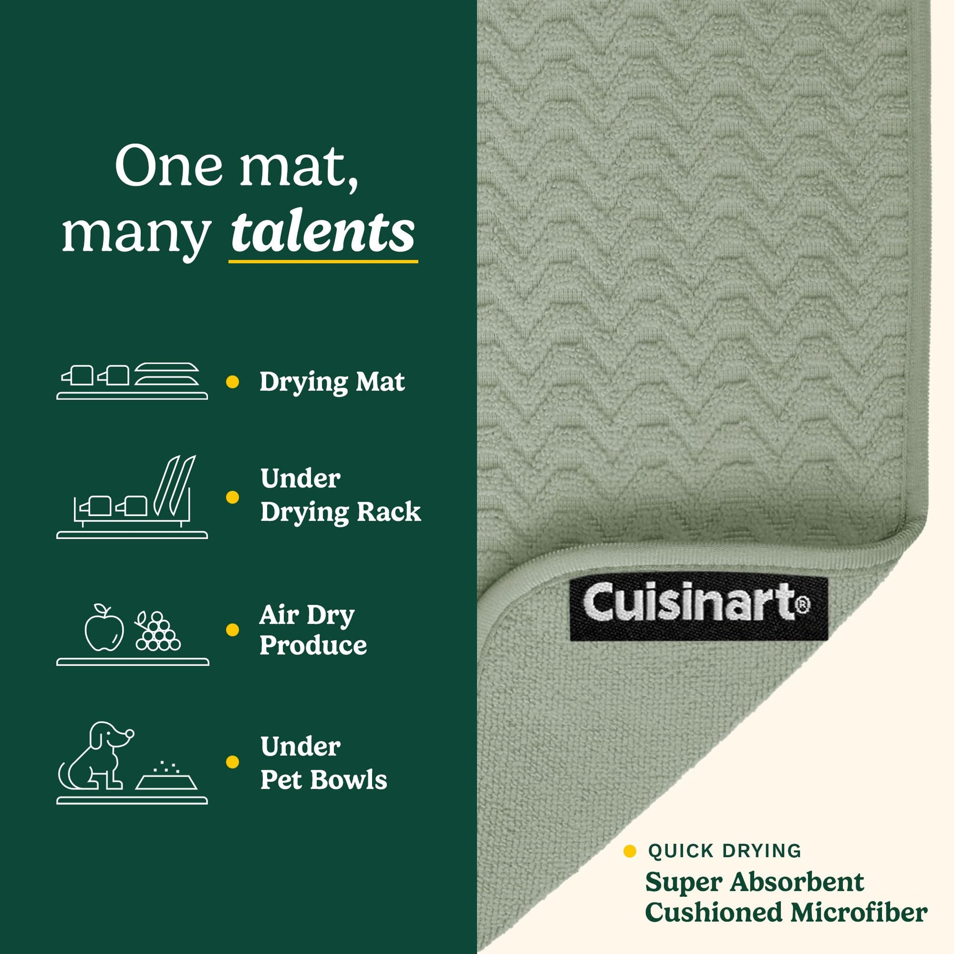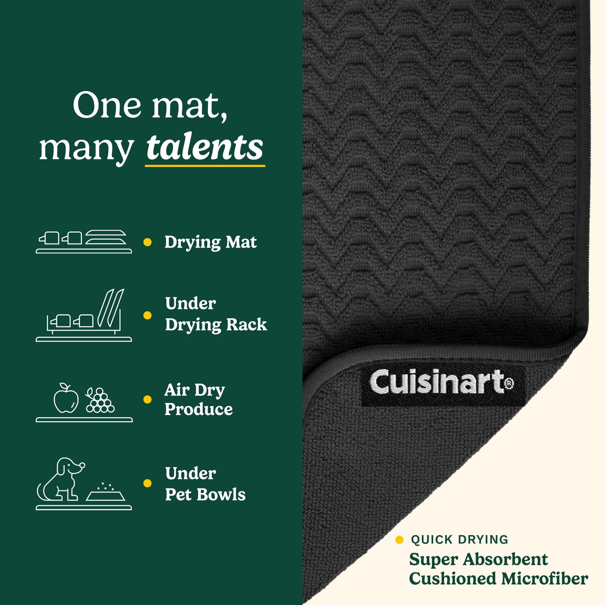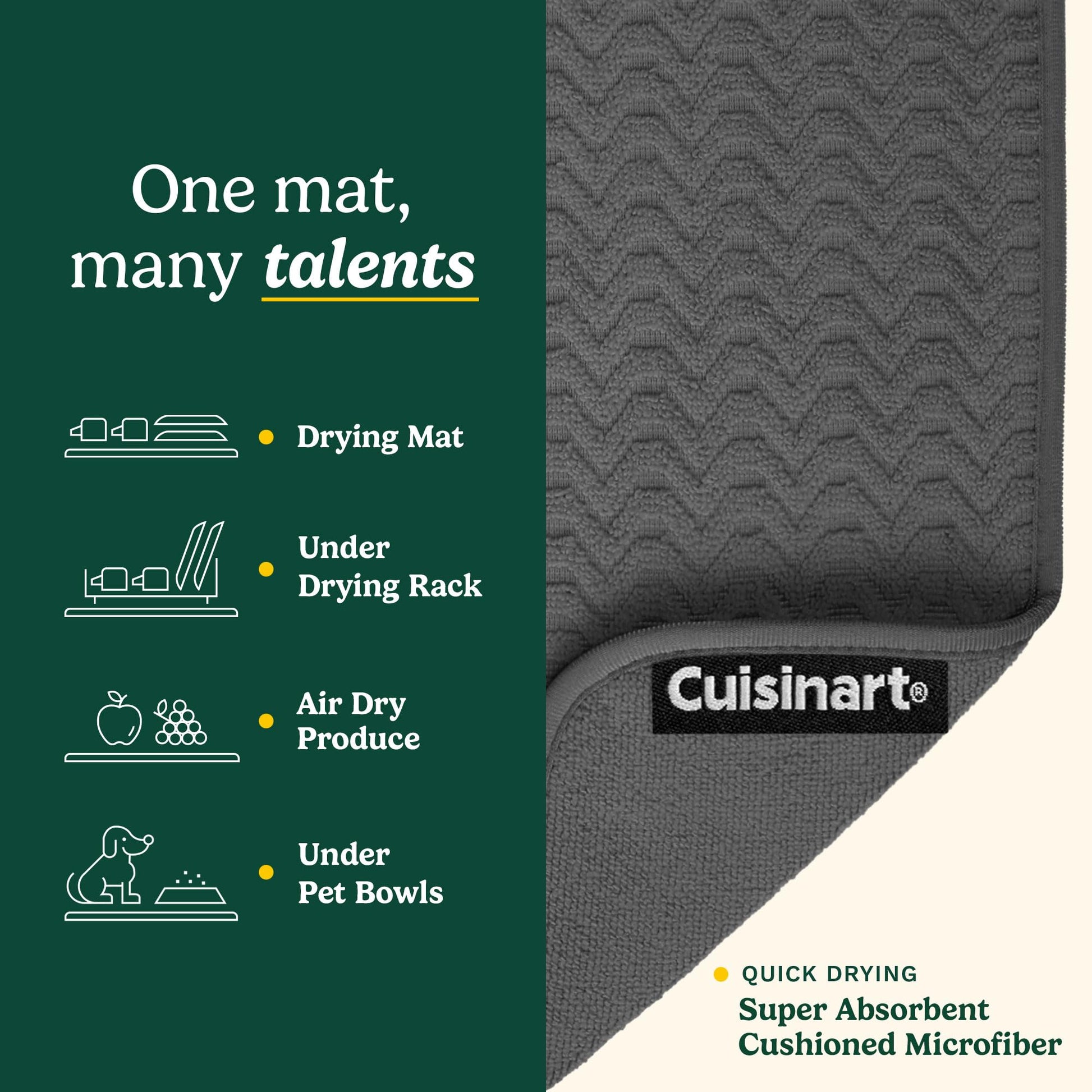 - LONG-LASTING DURABILITY & EASY MAINTENANCE – Cuisinart’s microfiber drying mats retain absorbency and structure after repeated use and machine washing. Designed for shoppers looking for a reliable alternative to thin, quickly worn drying mats.