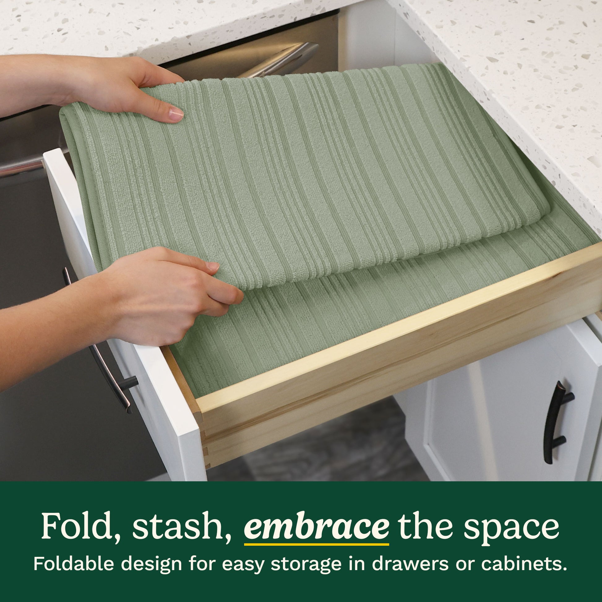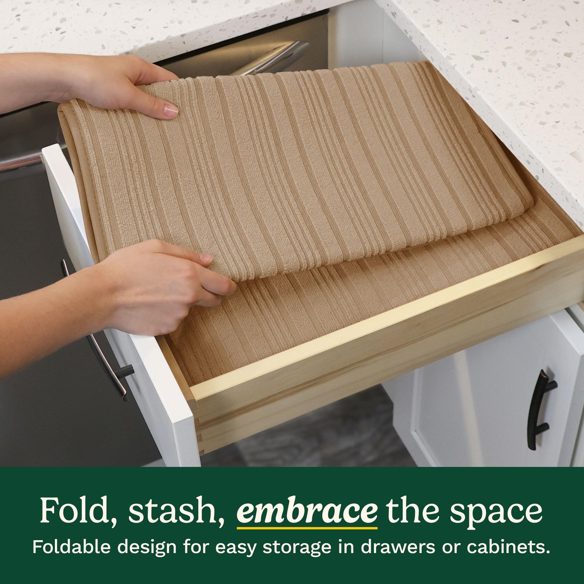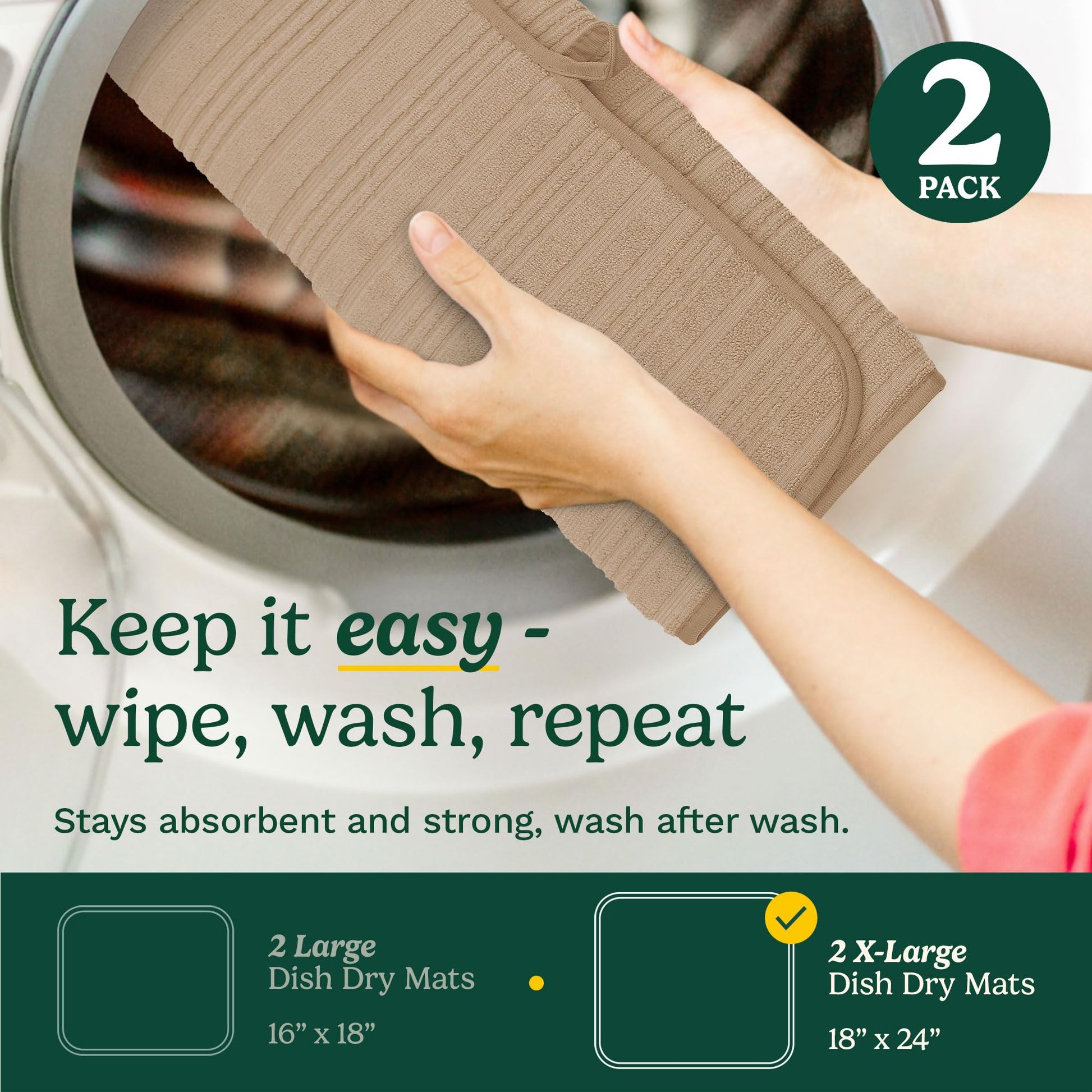 - DOUBLE THE CONVENIENCE WITH A 2-PACK – This dish drying mat for kitchen counter comes as a two pack; use one mat while the other is in the wash, or place mats in multiple areas. Perfect for apartments, dorm rooms, RVs, and small-space kitchens.